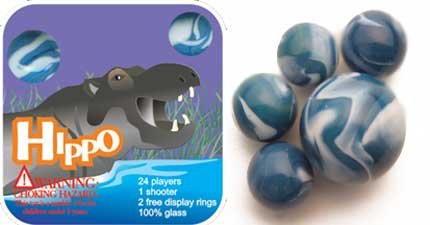 Mega Marbles HIPPO MARBLES. Game net includes a colorful themed header card with one Shooter Marble, 24 Player Marbles and 2 display rings. 100% Glass. The Shooter marble is approx. 1" in diameter and the Player marbles are approx. 5/8" in diameter.