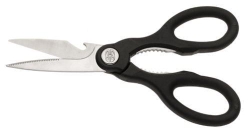 From snipping herbs to cutting through tough chicken cartilage, these sharp kitchen shears perform numerous functions. There’s even a nutcracker between the contoured, comfort grip handles and a bottle opener on one of the blades. Made of high carbon, no-stain steel and handles that won’t absorb moisture, crack, or peel, these shears are covered by Calphalon’s lifetime warranty. --Ann Bieri