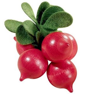Vegetables are always a great addition to your child's food play. Great way to teach children the importance of including vegetables Charming bunch of red radishes held together with a removable green rubber band. Perfect size for your little one's hands. Another great creation by Haba. A bunch of 5 radishes